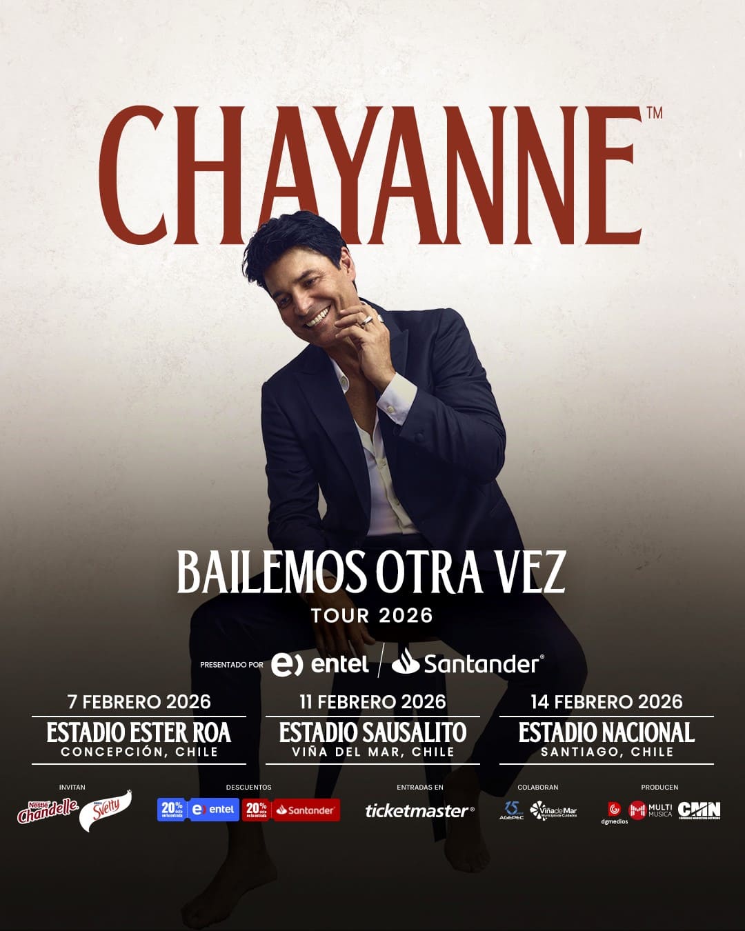 No te pierdas el regreso de Chayanne a Chile en 2026 el próximo 11 de febrero en el Estadio Sausalito de Viña de Mar y el 14 de febrero en el Estadio Nacional en Santiago.